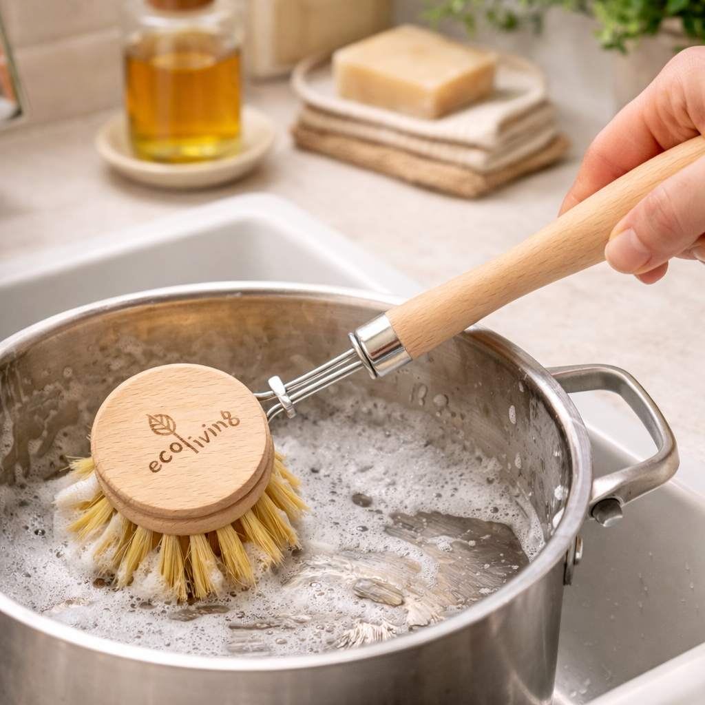En plastfri oppvaskbørste med plantebaserte børstehår, laget av naturlige og fornybare materialer.