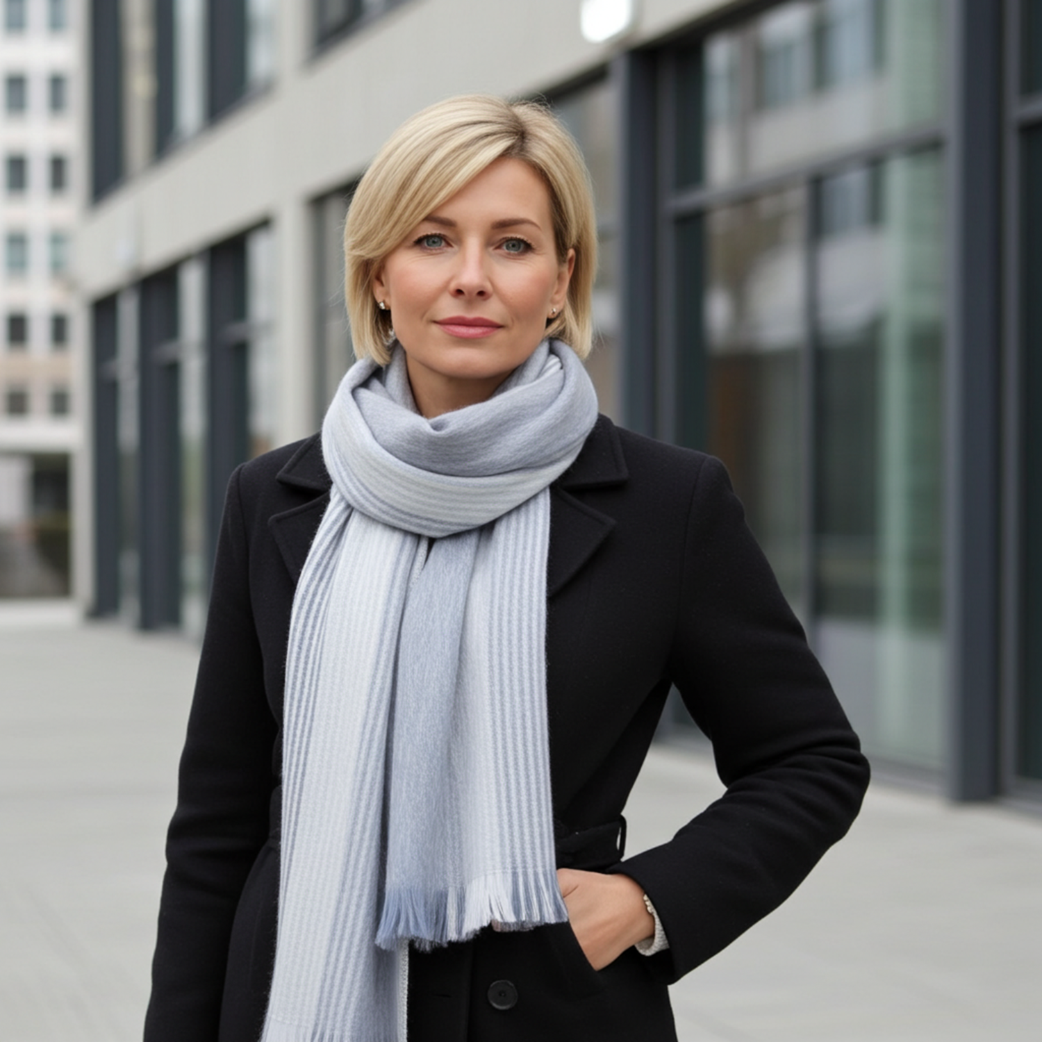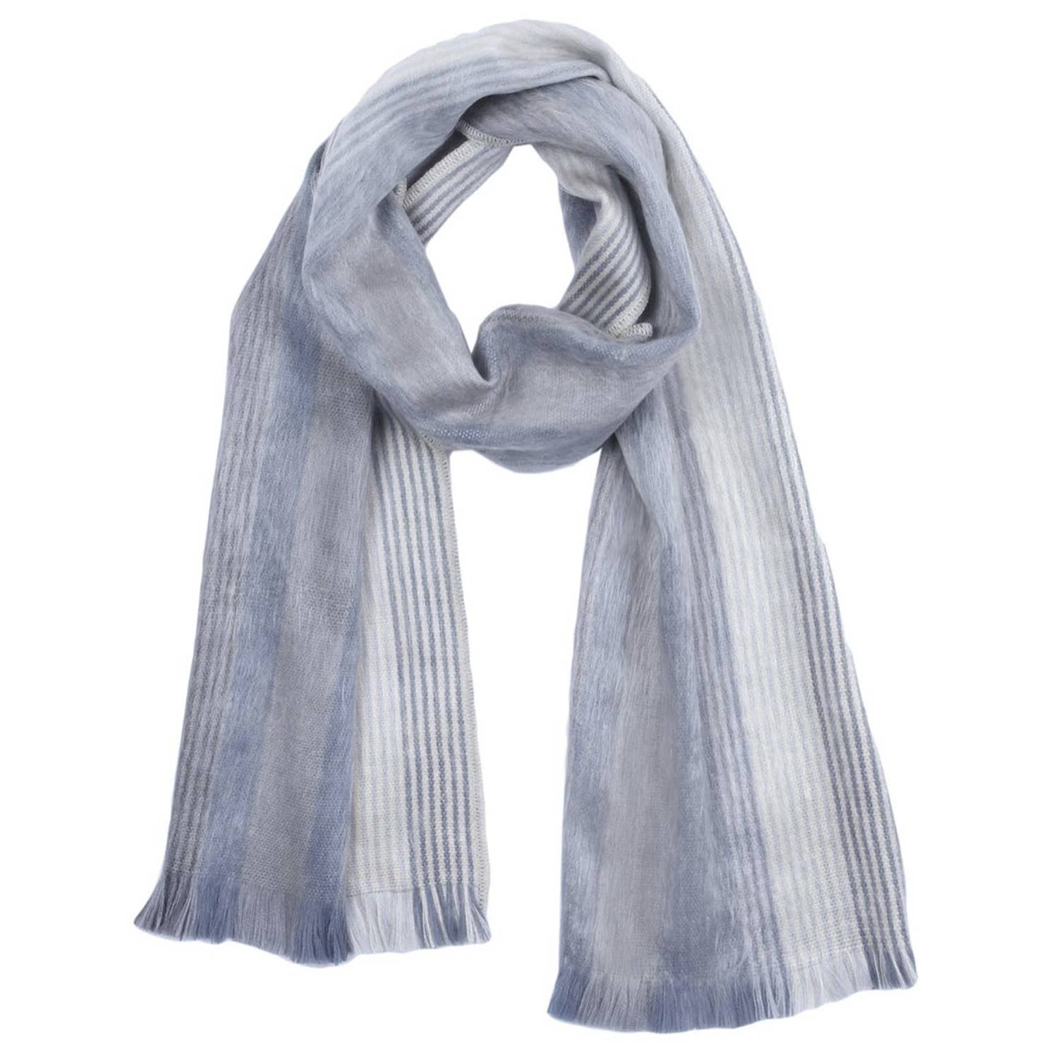 Polar Drift Brushed Alpaca Scarf har ett svalt och lugnande uttryck, med en harmonisk palett av isblått, mjukt grått och krispigt vitt i alternerande ränder som framkallar vinterns naturliga elegans. Den lätta, borstade finishen ger en molnliknande mjukhet och behaglig värme utan att kännas tung , perfekt för sofistikerade säsongskollektioner.