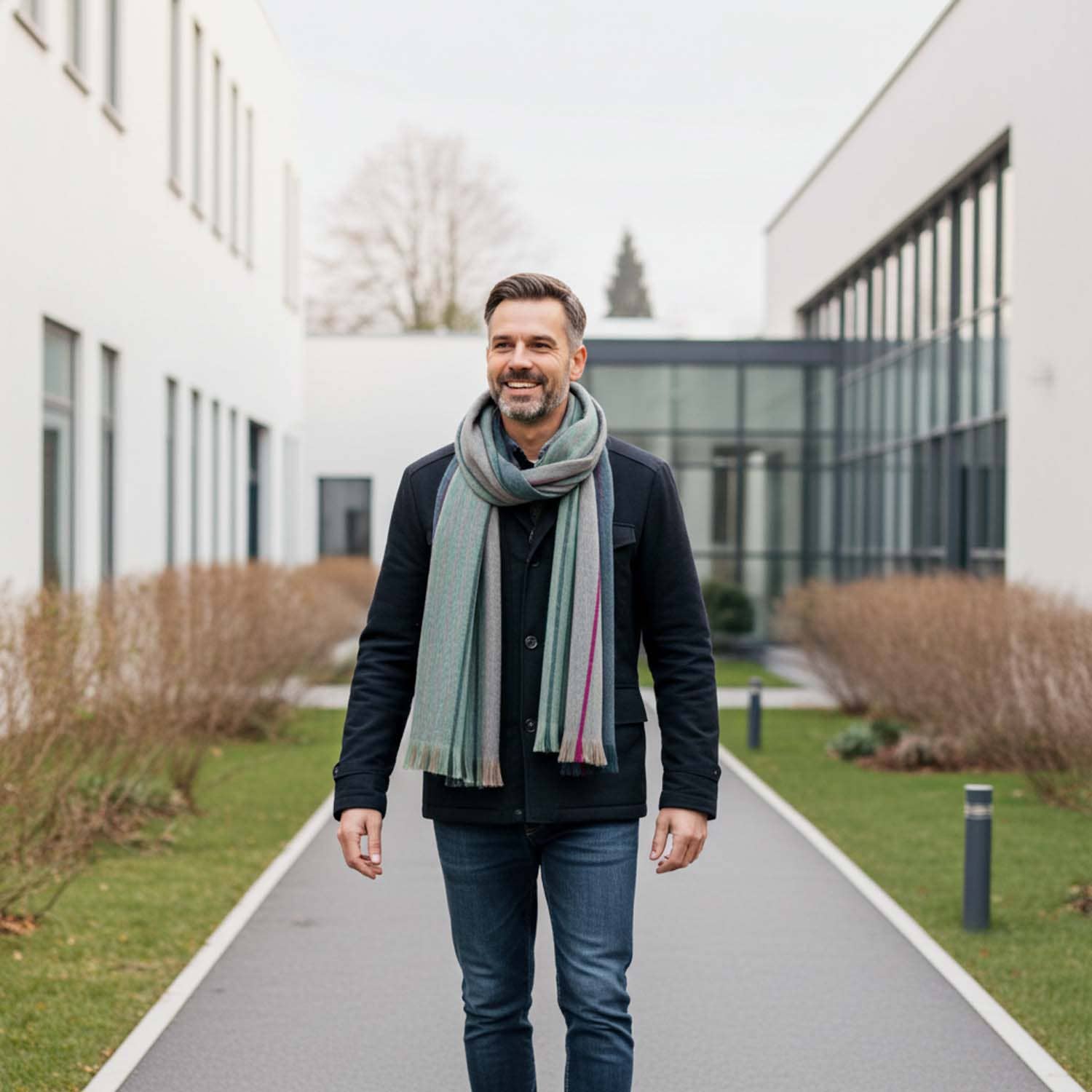 Wild Wasabi Brushed Alpaca Scarf är lekfull och modern, med ett randig färgschema i salviagrönt, blågrönt, antracitgrå och fräscha fuchsia-accenter . Halsduken är tillverkad av en borstad alpackablandning som ger en fjäderlätt känsla och en lyxigt mjuk textur , med precis rätt mängd värme.