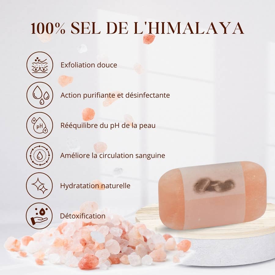 Denna 100 % naturliga, handgjorda tvål är berikad med Himalayasalt , rikt på viktiga mineraler som magnesium, kalium och kalcium. Den exfolierar varsamt , rengör huden och stimulerar blodcirkulationen, vilket ger en känsla av fräschör och mjukhet .